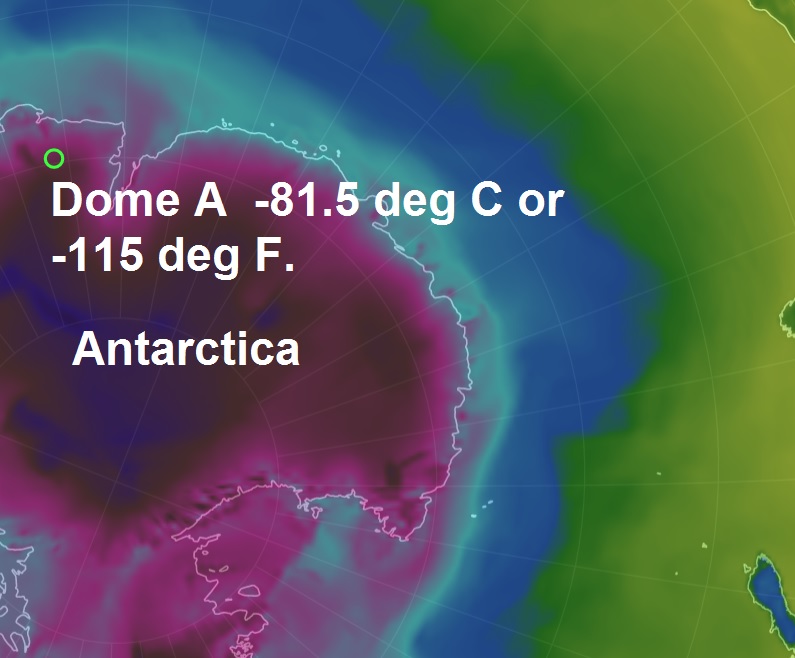 If you like it cool then the best place for you today is Dome A (Antarctica) where the temperature dropped to an incredible -81.5 deg C or -115 deg F.